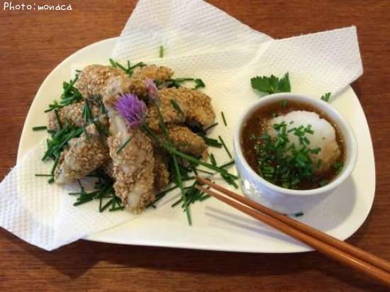 「ごまの変わり衣揚げ、チャイブのおろしだれ添え」にしてみました(^o^)/