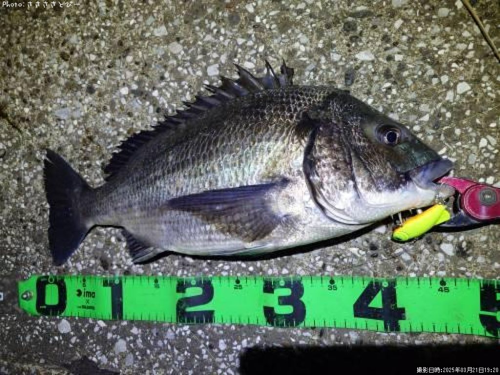2025年3月21日19時20分に釣れたクロダイのポイント千葉県内房(関東地方)ささささとぴーさん釣果詳細情報です。この情報を詳しく見ることで、ルアー、ロッド、タックル(仕掛け)など効率よく自分なりの爆釣を初心者でも狙うことができます。