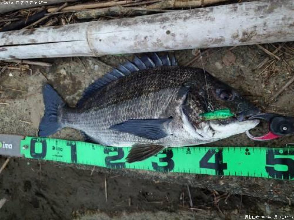 2025年6月1日17時24分に釣れたクロダイのポイント千葉県内房(関東地方)ささささとぴーさん釣果詳細情報です。この情報を詳しく見ることで、ルアー、ロッド、タックル(仕掛け)など効率よく自分なりの爆釣を初心者でも狙うことができます。