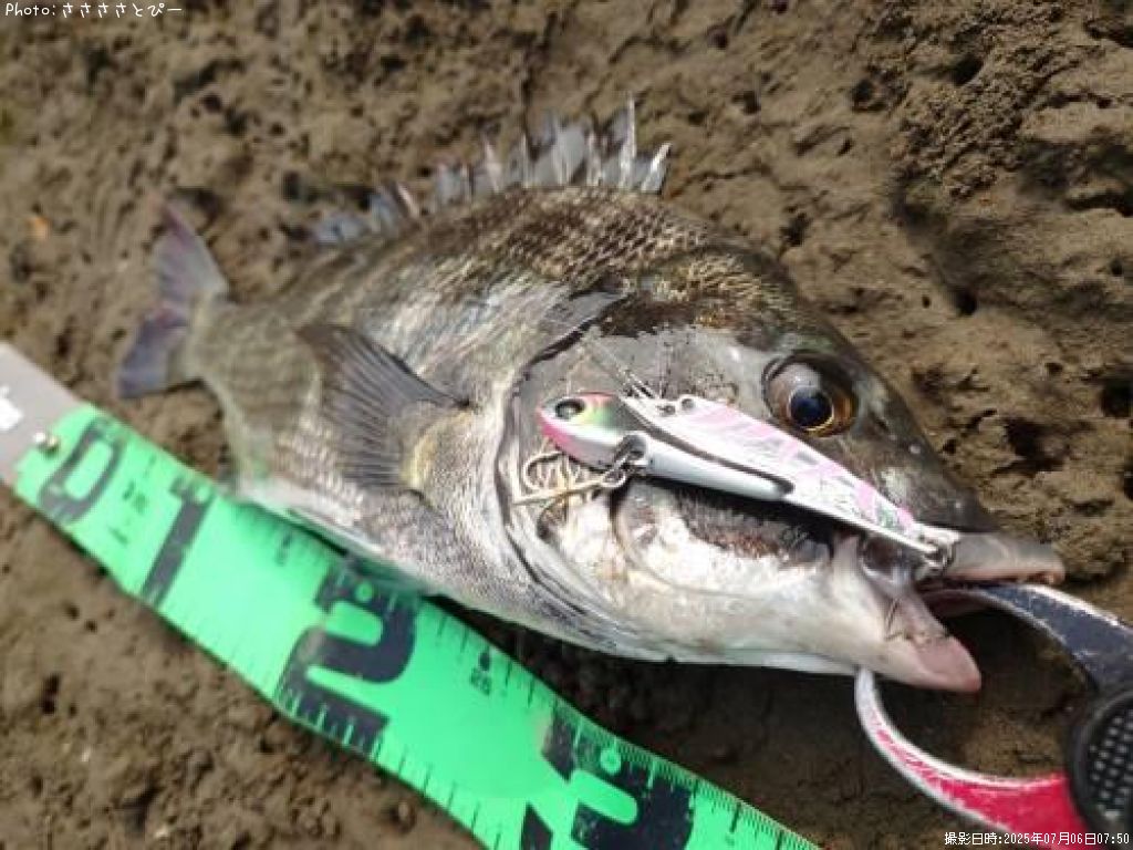 2025年7月6日7時50分に釣れたクロダイのポイント千葉県内房(関東地方)ささささとぴーさん釣果詳細情報です。この情報を詳しく見ることで、ルアー、ロッド、タックル(仕掛け)など効率よく自分なりの爆釣を初心者でも狙うことができます。