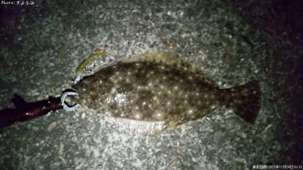 2025年11月24日18時24分に釣れたヒラメのポイント千葉県白子(関東地方)きよふみさん釣果詳細情報です。この情報を詳しく見ることで、ルアー、ロッド、タックル(仕掛け)など効率よく自分なりの爆釣を初心者でも狙うことができます。