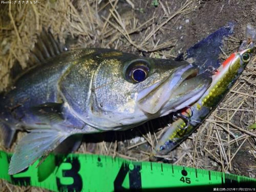 2025年11月2日18時57分に釣れたシーバスのポイント千葉県内房(関東地方)ささささとぴーさん釣果詳細情報です。この情報を詳しく見ることで、ルアー、ロッド、タックル(仕掛け)など効率よく自分なりの爆釣を初心者でも狙うことができます。