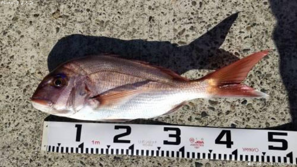 2025年11月24日12時17分に釣れたマダイのポイント千葉県勝浦(関東地方)きよふみさん釣果詳細情報です。この情報を詳しく見ることで、ルアー、ロッド、タックル(仕掛け)など効率よく自分なりの爆釣を初心者でも狙うことができます。