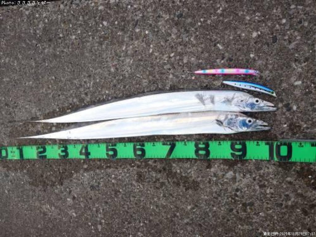2025年11月29日6時14分に釣れた太刀魚のポイント千葉県内房(関東地方)ささささとぴーさん釣果詳細情報です。この情報を詳しく見ることで、ルアー、ロッド、タックル(仕掛け)など効率よく自分なりの爆釣を初心者でも狙うことができます。
