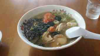 大漁ラーメン。カニの爪、大振りのエビ、ホタテ、ムール貝、ツブ貝、岩のりがトッピングされた贅沢ラーメン。塩味が魚介類の旨みを引き出してこれがなかなかいける。ボリュームにも満足です。
