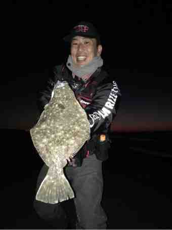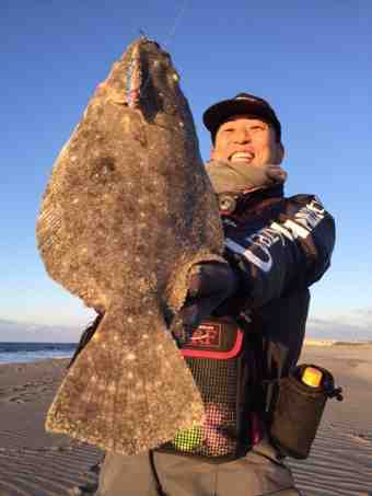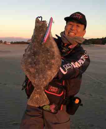 で、まわりのアングラーも帰りだし諦めムードが漂い始めた頃、サーフヒラメの天才児サスケ様のロッドに三たびググンッ!!!